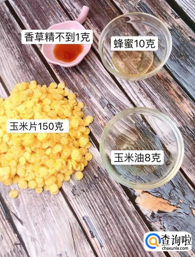 首先我们要做的是准备好所有要用到的材料如下图所示。小贴士:香草精(快1g);玉米片(150克);蜂蜜(10g);玉米油(8g)。