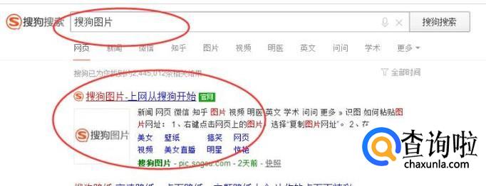 在浏览器中输入【搜狗图片】,然后点击具有官网标志的链接,如下图所示:
