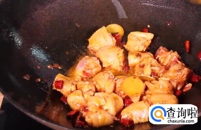 锅里热好油之后,放入豆瓣酱炒匀后加入姜片和干辣椒,翻炒几下之后,将鸡肉放进去,和调料一起翻炒均匀。