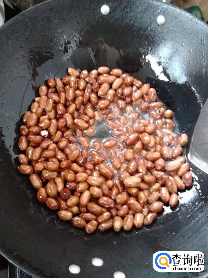 首先将花生仁取出,放入油锅中爆炒至花生传出香味,然后将花生仁取出放在一旁冷却。