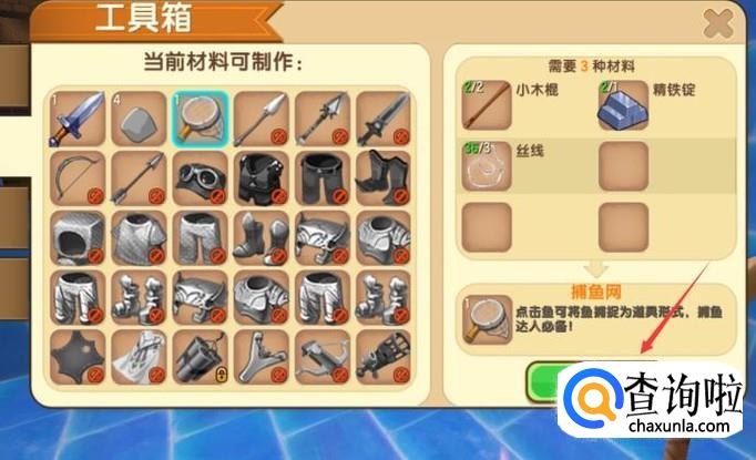 我们先需要准备一个捕鱼网,需要用精铁锭,丝线和小木棒制成。