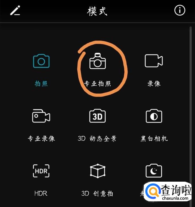 在出现的界面中选择“专业相机”选项,然后回到相机主界面