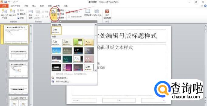 比如为幻灯片选择一个合适的主题,选中主题后,就可以看到幻灯片的背景全部更改了。