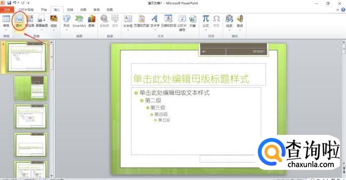 如果我们想要给所有的幻灯片插入一张图片,就需要选中第一张幻灯片,然后点击插入下方的“图片”。