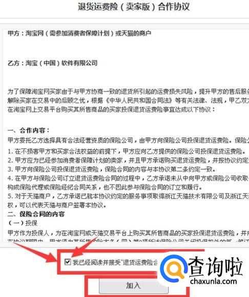 加入之后,淘宝会有一个协议,在“我已经阅读并接受“前点√,然后点击加入就可以啦。完成。