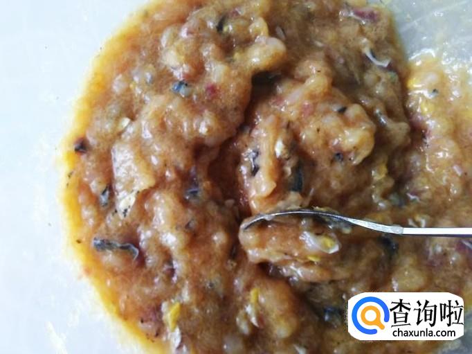 然后用勺子顺着一个方向搅10分钟左右,搅到鱼肉出胶很粘为止。