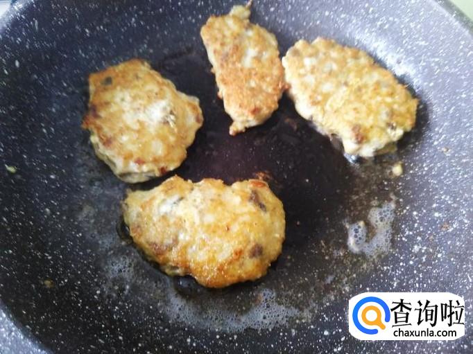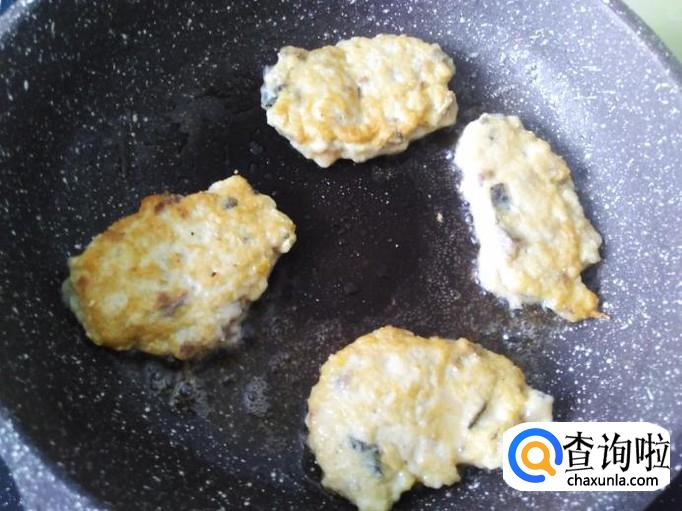 用小火慢慢煎,煎得3分钟左右把鱼饼翻转。