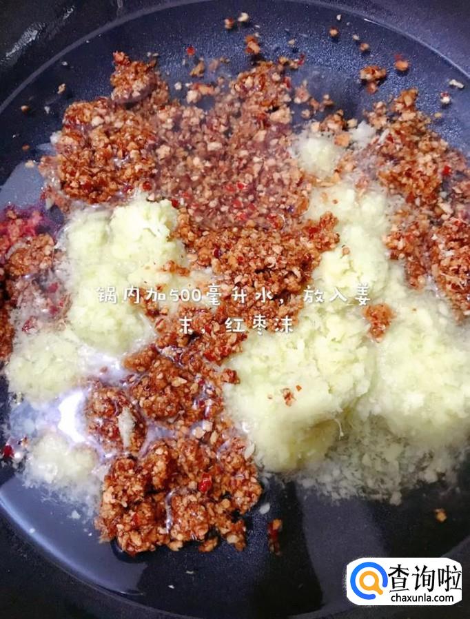 然后锅中放入500ml的清水,倒入红枣泥和生姜泥,开大火煮五分钟,如下图所示。