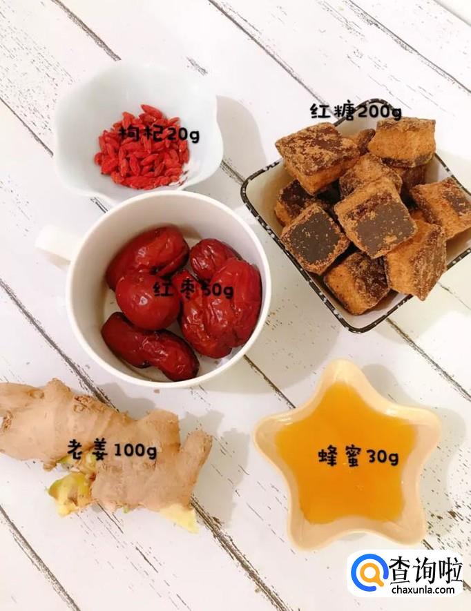 食材:枸杞20克,红枣50克,老姜100克,蜂蜜30克,红糖200克。