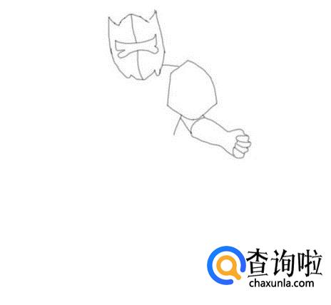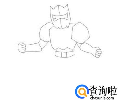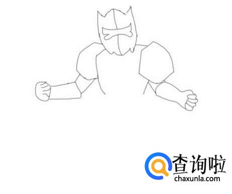 再在头部下面的右侧画出铠甲勇士的右肩膀,并在右肩膀的基础上画出铠甲勇士的右胳膊及手部,如图所示:
