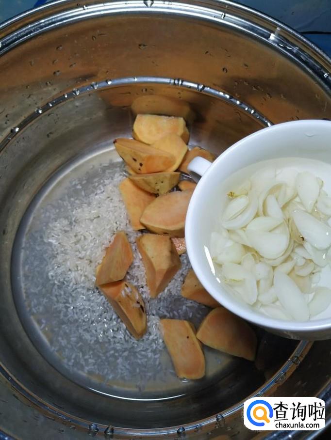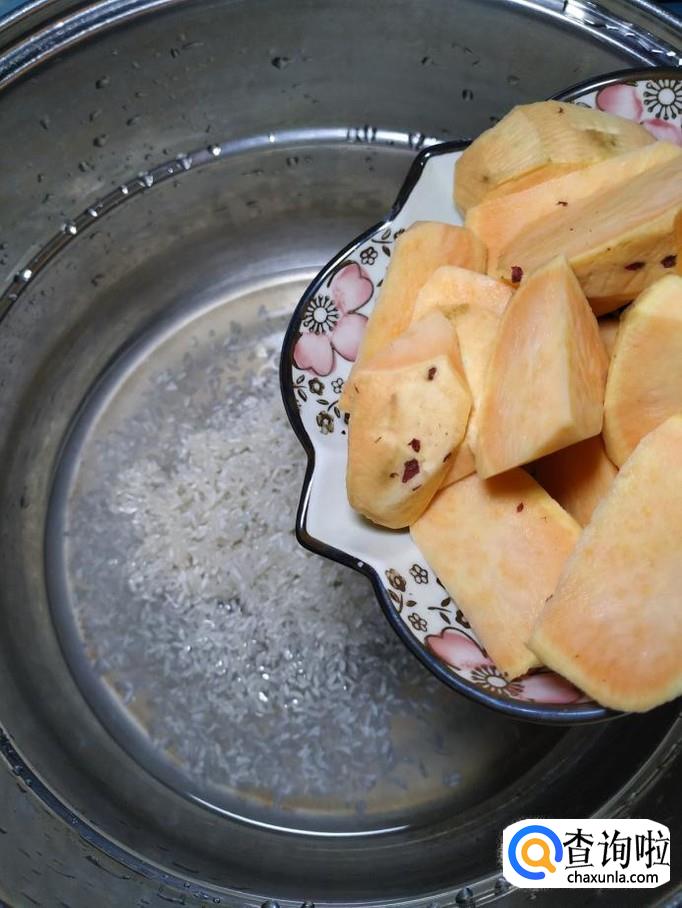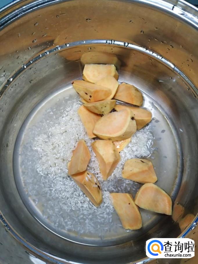将切好的红薯,倒入锅中,和大米放在一起。