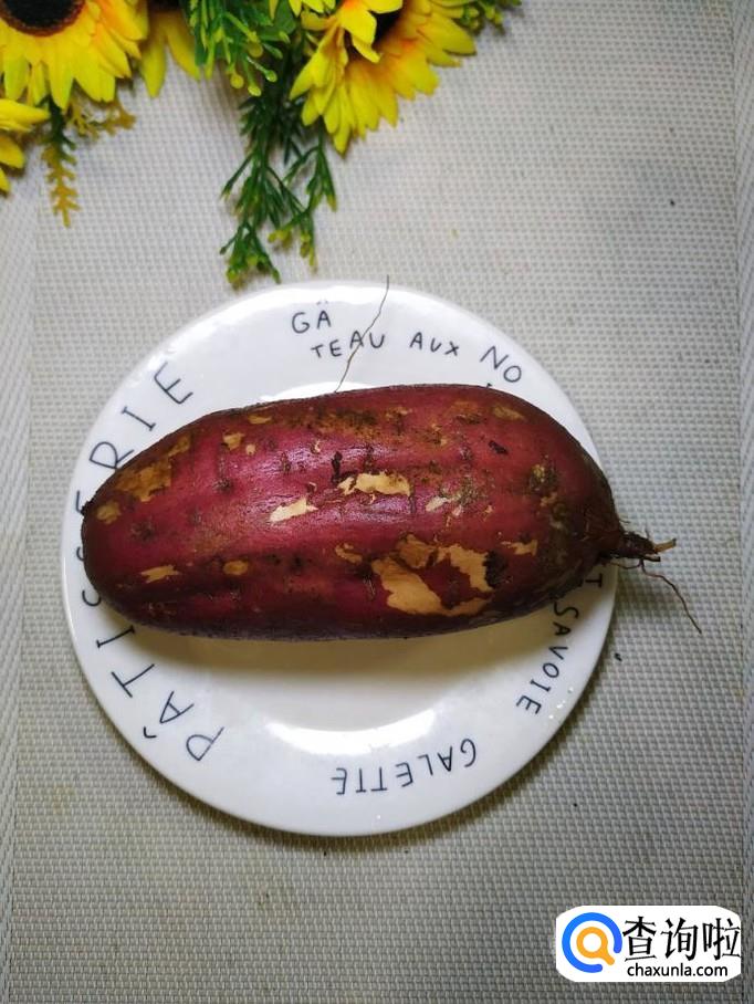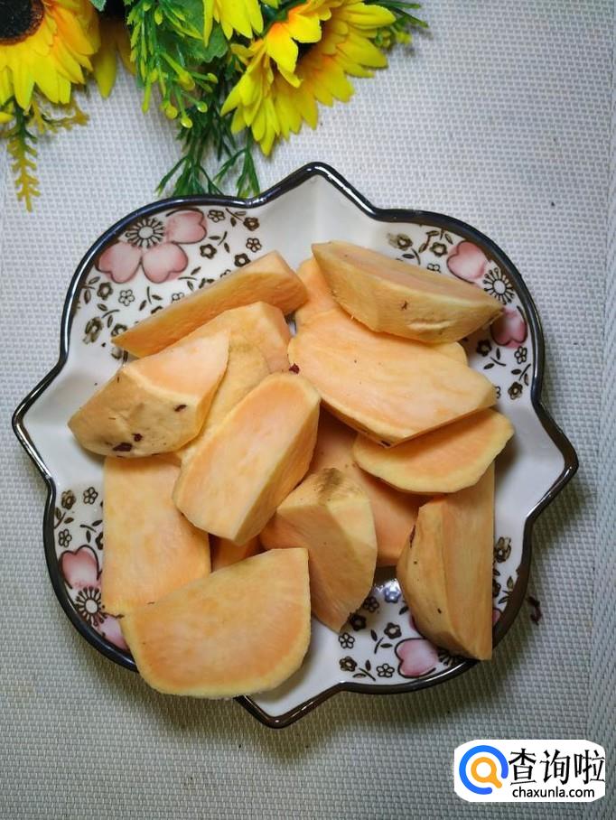 准备一个红薯,用清水洗净后,去皮,切成滚刀块,放入盘中备用。小贴士:红薯,尽量选用比较甜一些的红薯,这样口感更好。