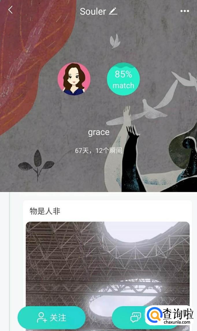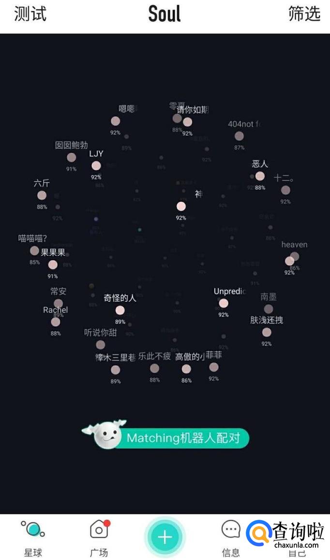 打开soul客户端,看到风景页面过后,会出现很多小星球在移动,可以进行摇一摇进行切换另外的星球。只要点击在游动的任意星球,即可看到与自己配对的星球,可以看到你们match的概率,也能看到该星球所发布的内容,可以点击关注和私聊。