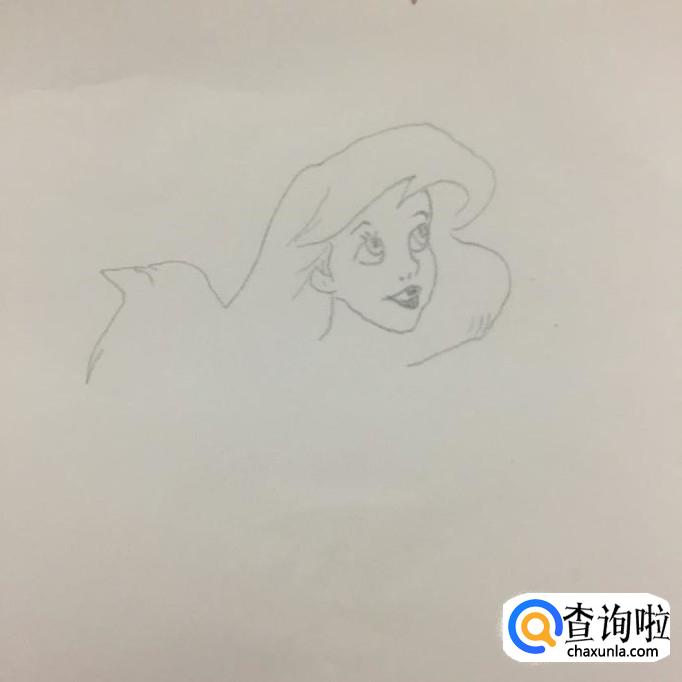 接着画出美人鱼的脸部器官,如下图所示。画美人鱼眼睛的时候,应画的左大右小会比较好。