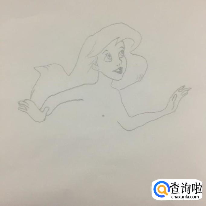 然后画出美人鱼的双手,如下图所示。画美人鱼双手的时候,注意手臂宽度为脑袋宽度的三倍左右为宜。