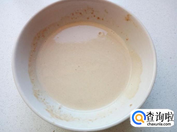 取一匙儿芝麻酱在碗中,放入水,拌和成浆糊状。
