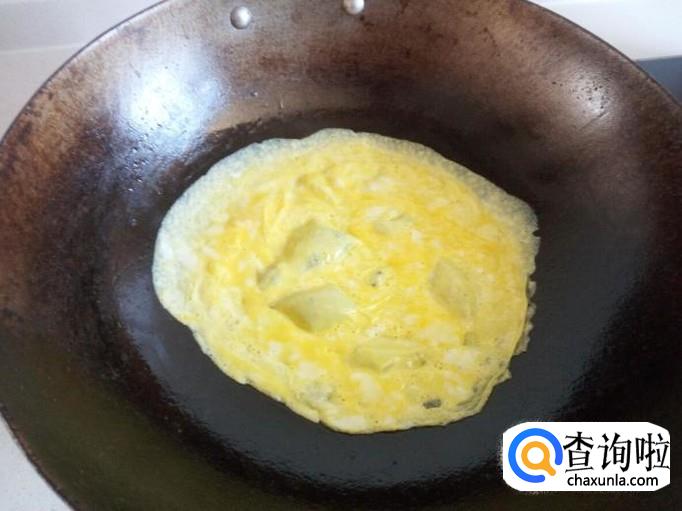 锅内放少许油,不粘锅底即可,把鸡蛋液倒入锅中,小火煎塌成薄饼。