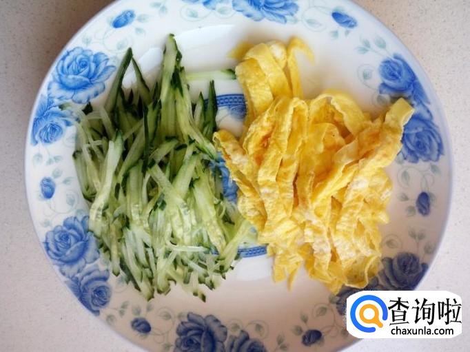 把煎好的鸡蛋薄饼,切成丝,放入盘中,备用。