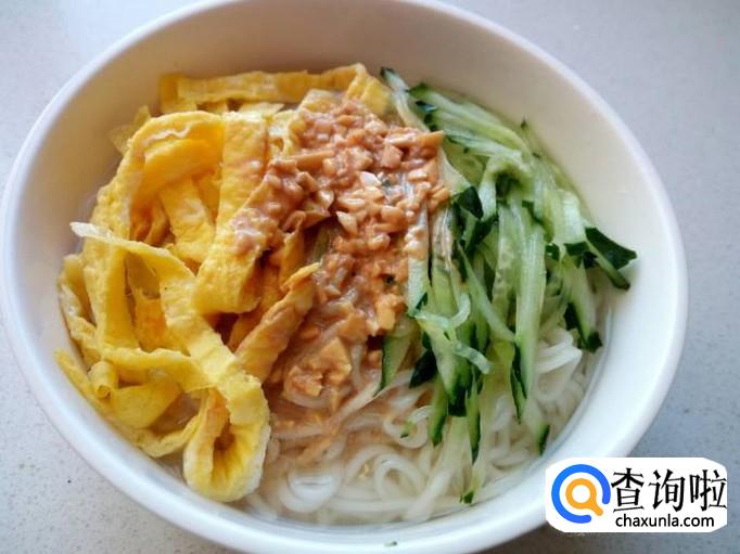 把面盛入碗中,放入黄瓜,鸡蛋丝,再放入调拌好的芝麻酱汁,即可食用。