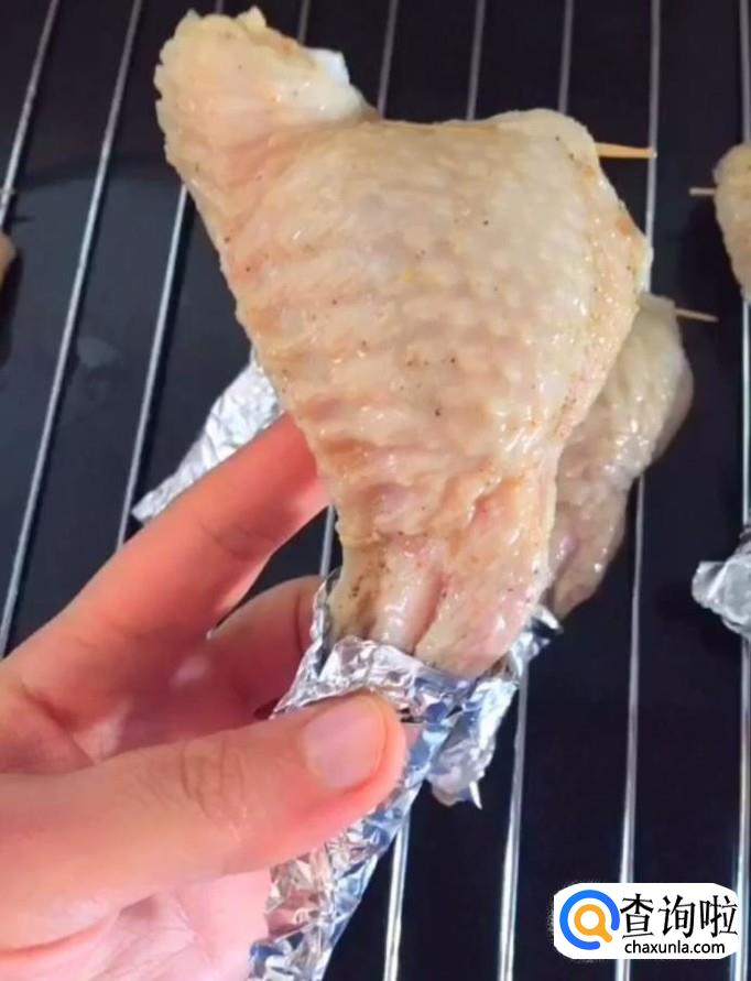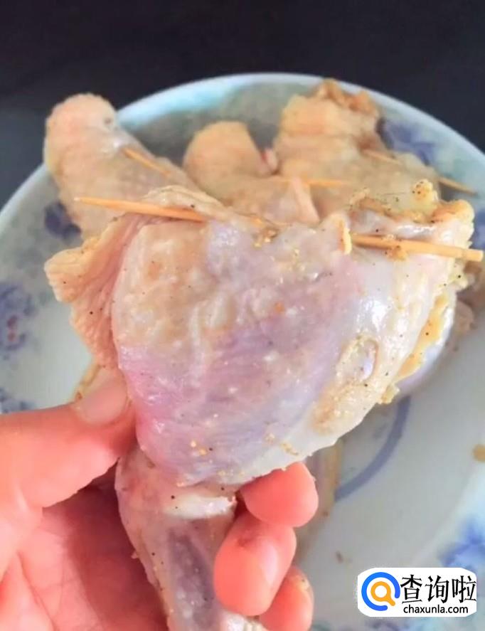 接着我们用腌好的鸡翅装上炒好的蛋炒饭,装八分满即可,用牙签封口,然后将鸡翅尖用锡纸包上防止烤糊