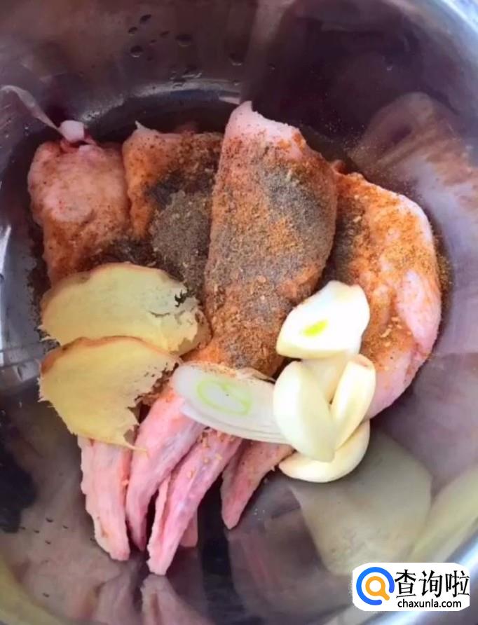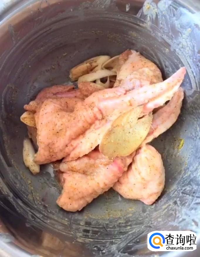 接着我们将处理好的鸡翅放入一个盆中,加入花椒粉,盐,鸡精,姜蒜