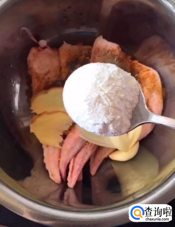 然后我们再倒入一勺的玉米淀粉,搅拌均匀腌制十分钟