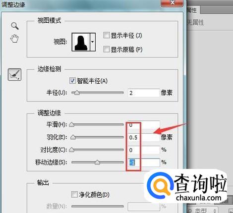点击调整边缘选项在弹出的对话框内我们依次设置参数如图所示: