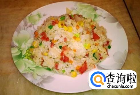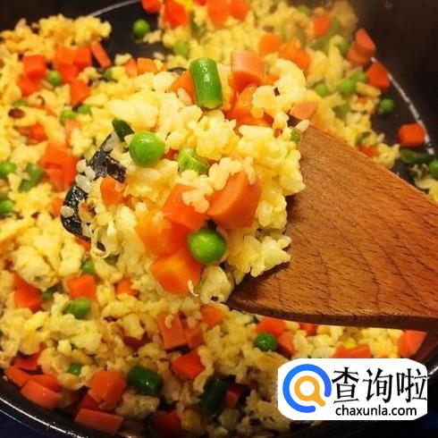 米饭、油、鸡蛋、葱花、玉米粒、火腿丁、萝卜丁、豌豆、青菜