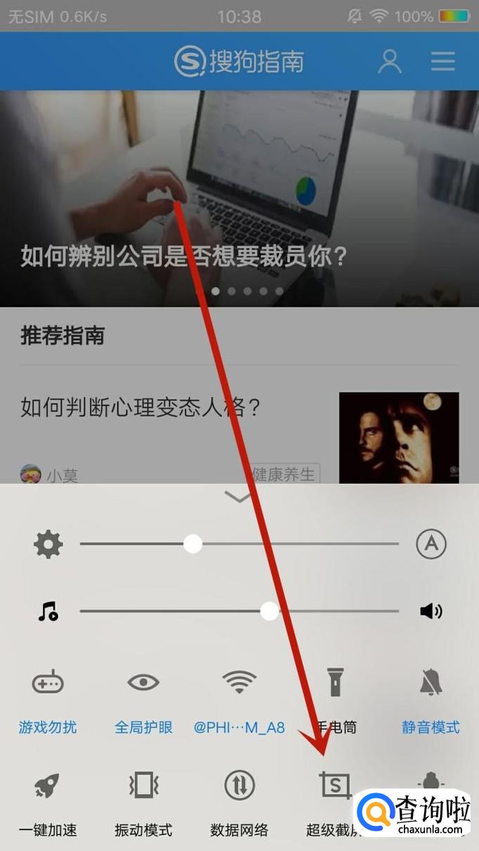 在需要截屏的页面从手机底部向上滑动,打开快捷操作菜单选择“超级截屏”,如图所示。