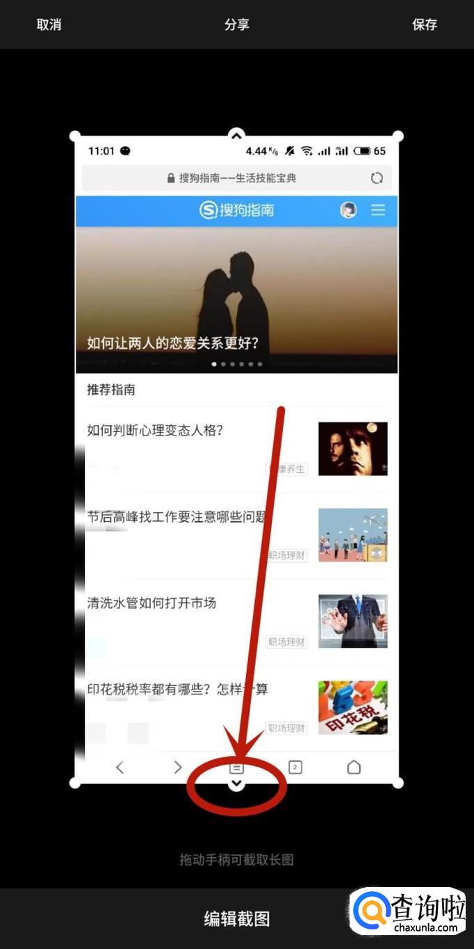 拖动图示位置的手柄,即可长截图,如图所示。