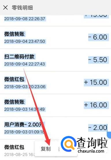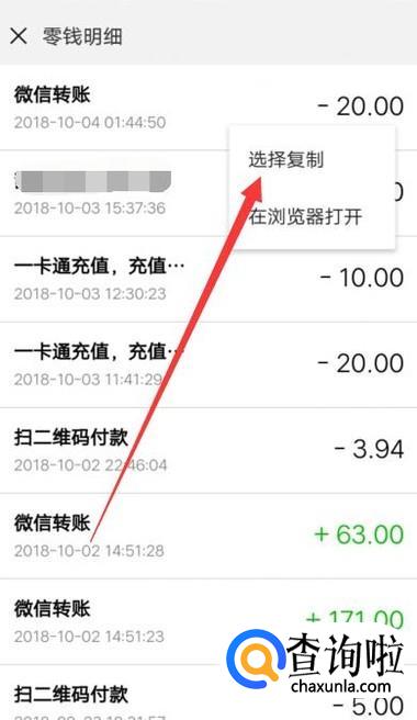 进入之后,按住账单一段时间,点击“选择复制”,如图所示。