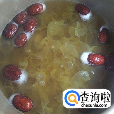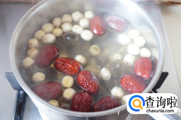 锅中(最好是砂锅或瓦锅)放入适量清水,将红枣、莲子放入锅中,大火煮沸后转小火煮40分钟。