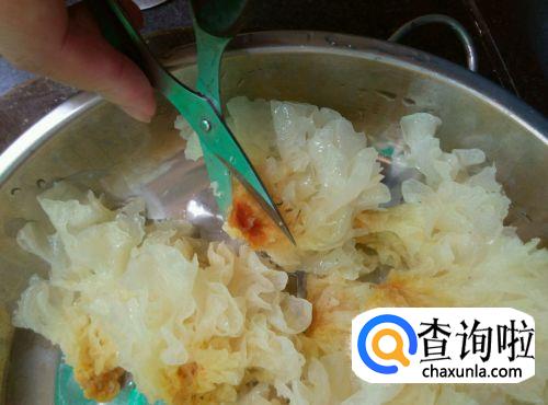 银耳洗净,用冷水浸泡两个小时后,将银耳去蒂撕成小块。