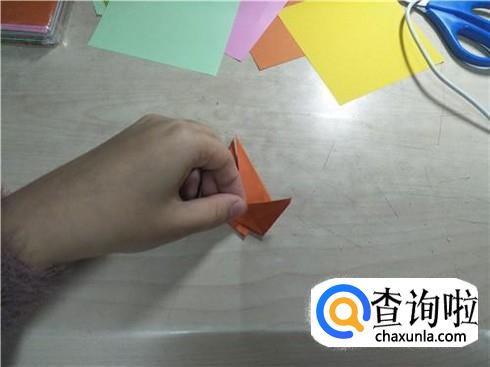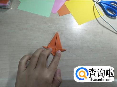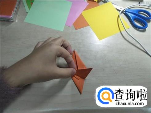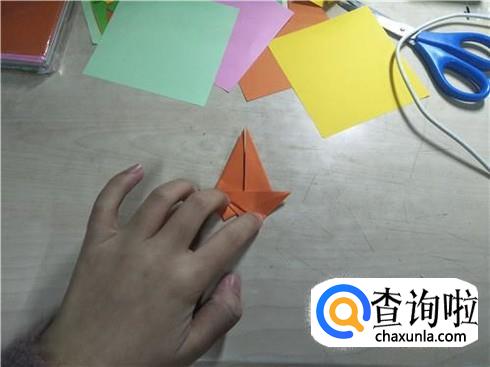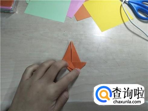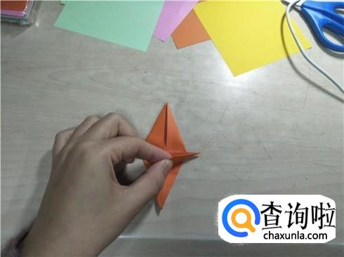 折叠好了之后,再将这个图形展开在下面部分,沿着中间的这条折痕进行折叠,同样一边要这样折叠两次左右两边都要这样折叠,折叠好了之后,再将旁边的这个小三角形将它折叠进去,最后就会形成如图所示的图形。