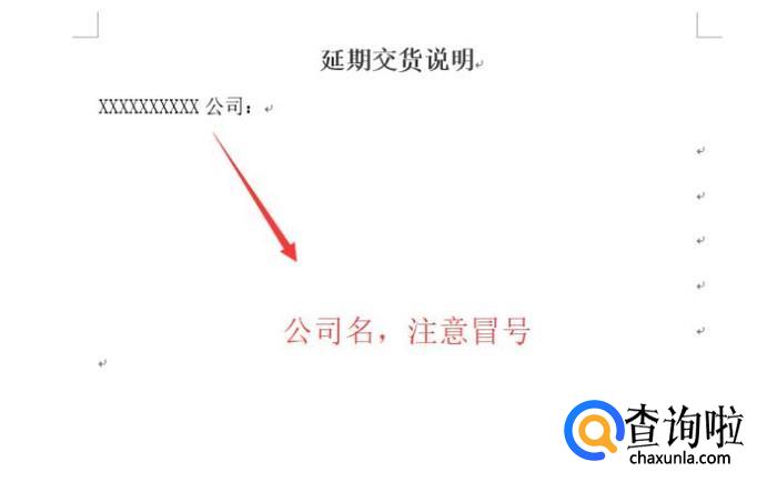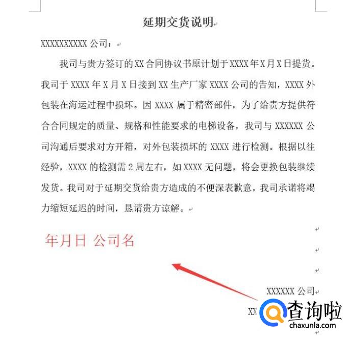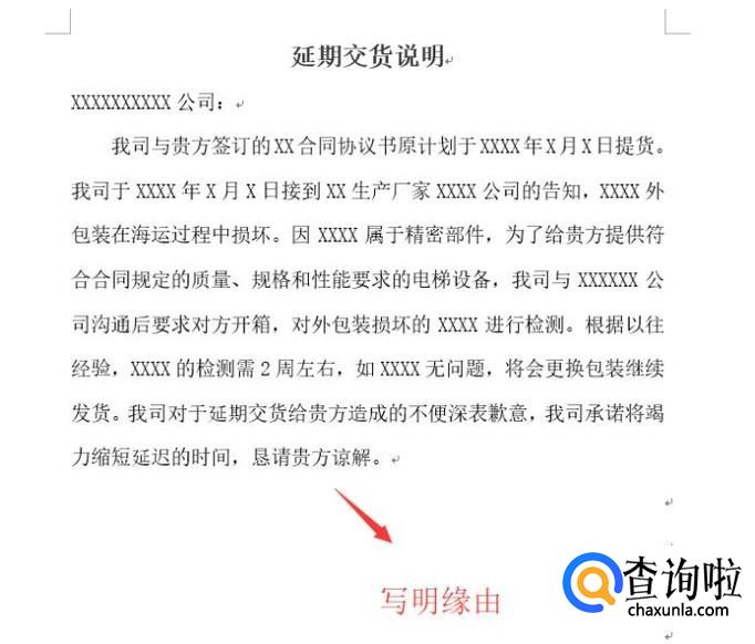 接下来编写正文了,注意正文要和收货公司错开四个字,如下图所示,在正文中要写明货物延迟的原因