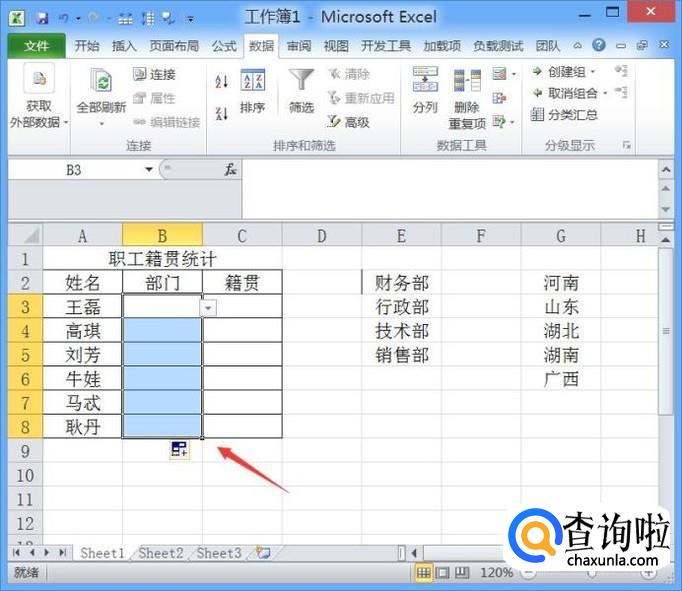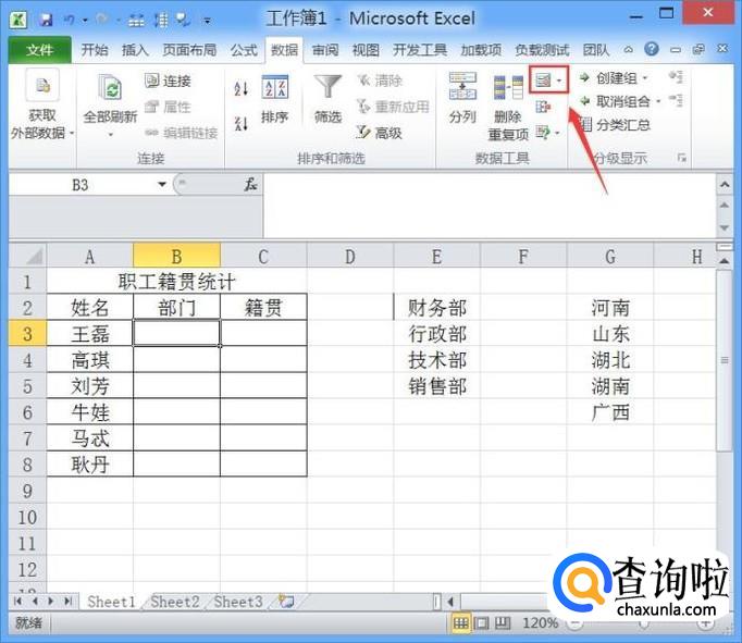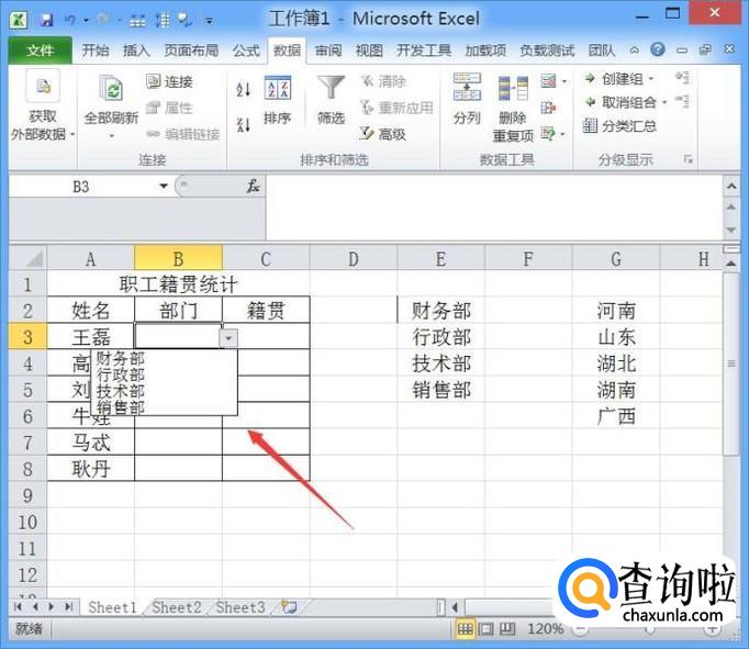 点击数据选项,在数据的工具区里找到数据有效性选项,如图所示: