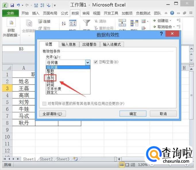 点击数据有效性选项,在弹出的对话框内我们找到允许选项,在允许内我们选择序列,如图所示: