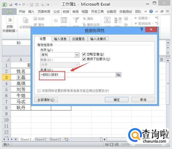 选择序列之后,然后在来源里输入引用的单元格,如图所示: