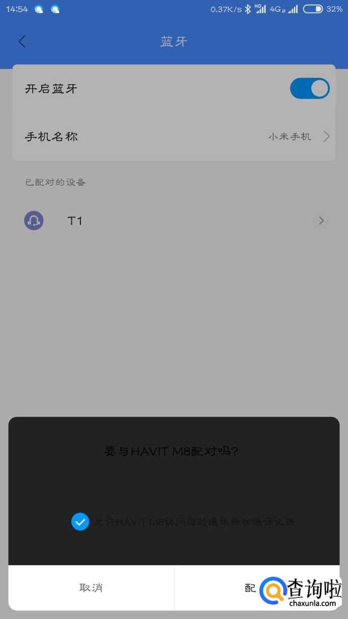 之后就开始连接蓝牙音箱了,过几秒钟会询问你是否让其访问设备,点击"配对"即可连接成功。