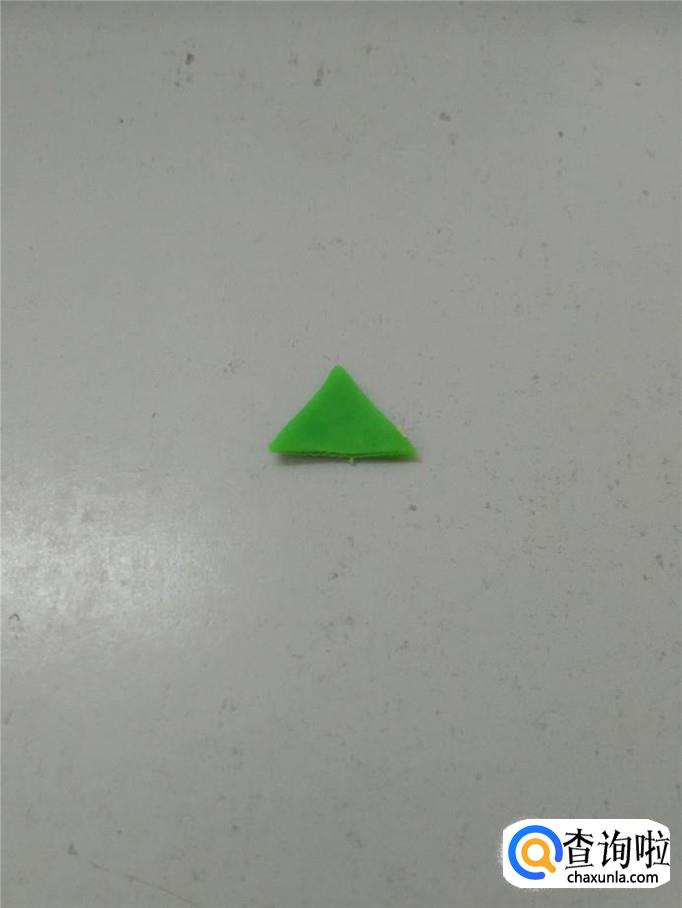 用绿色彩泥捏成一个三角形,两侧的边短一些,下面的边要长。这个三角形当作树顶。