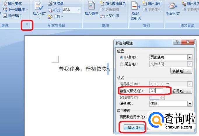 我们需要修改一下上标数字的格式,鼠标选中该数字后,如图所示,点击脚注旁边的向下斜箭头,弹出“脚注和尾注”选项框,手动输入中括号格式的自定义标记,点击插入。