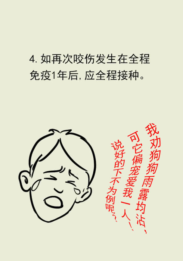 任何一次被狗咬伤后都应该及时处理,彻底进行伤口处理。一般情况下,全程接种狂犬病疫苗后体内抗体水平可维持至少1年。再次咬伤需要根据咬伤时间进行区别对待。