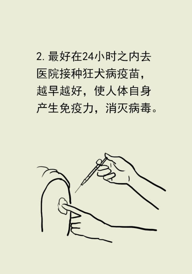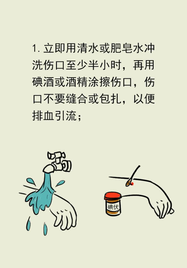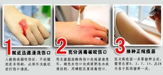 一洗:及时的对伤口进行清洗,最好用肥皂水清洗20分钟至半个小时,把含病毒的唾液和血水洗掉。如果伤口过深,就用注射器深入伤口深部进行灌洗,做到全面彻底。