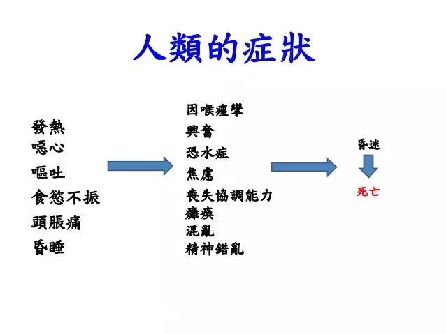 兴奋期约有两三天后,病人变得安静下来,但是,随之出现全身瘫痪,呼吸和血液循环系统功能都会出现衰竭,迅速陷入昏迷,十几个小时以后,就会死亡。