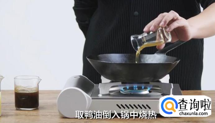 然后开始调酱汁。取鸭油倒入锅中烧热。