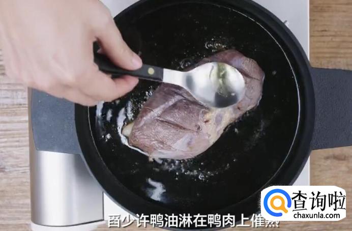 2、煎制的过程中,注意鸭皮需要朝下;烹饪中不用加其他油脂;