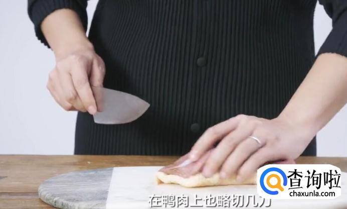 然后翻面,在鸭肉上也略切几刀,以便入味。
