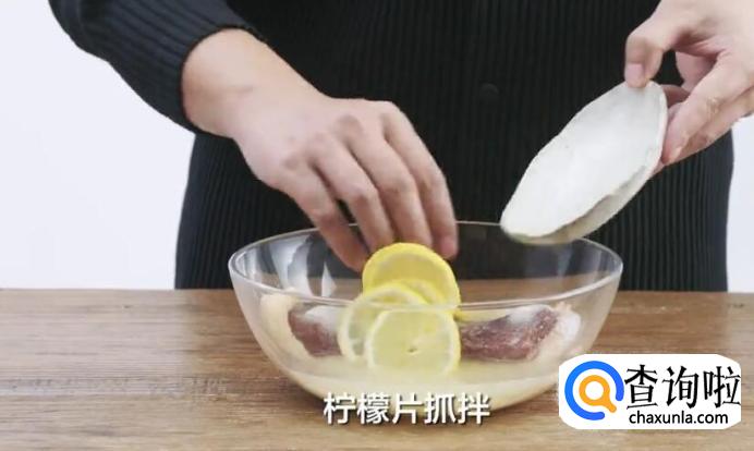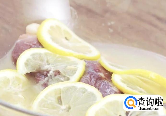 将鸭胸放入碗中,加入盐、糖、柠檬汁以及柠檬片进行抓拌。