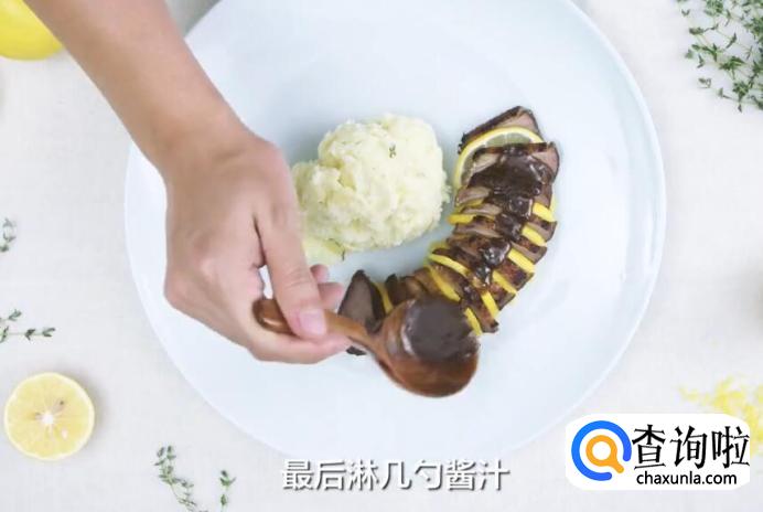 然后间隔着柠檬片装盘,摆上配菜(土豆泥),最后淋几勺酱汁。