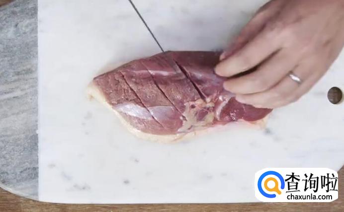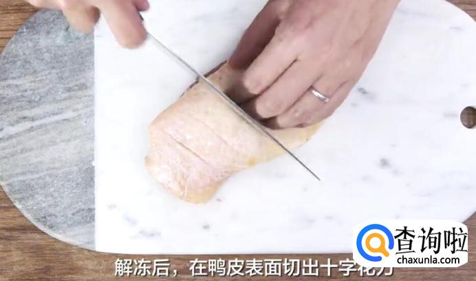 首先,我们需要处理鸭胸。解冻后,在鸭皮表面切出十字花刀。